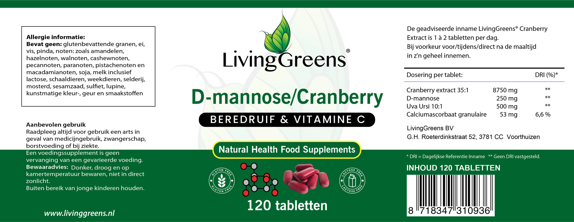 Livinggreens Cranberry met D Mannose 120 tabletten is een voedingssupplement.