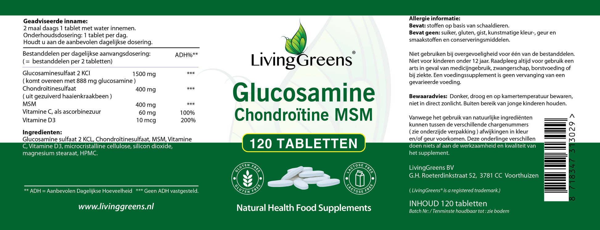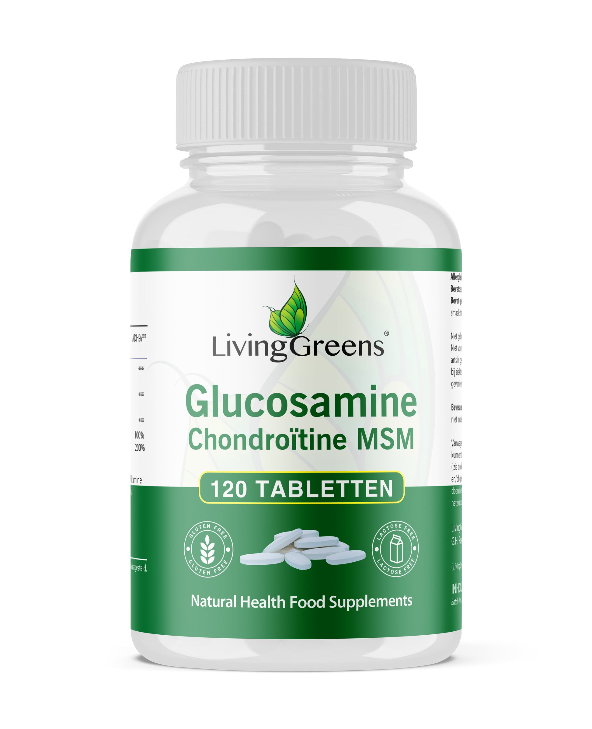 Livinggreens Glucosamine chondroitine MSM 120 tabletten is een voedingssupplement.