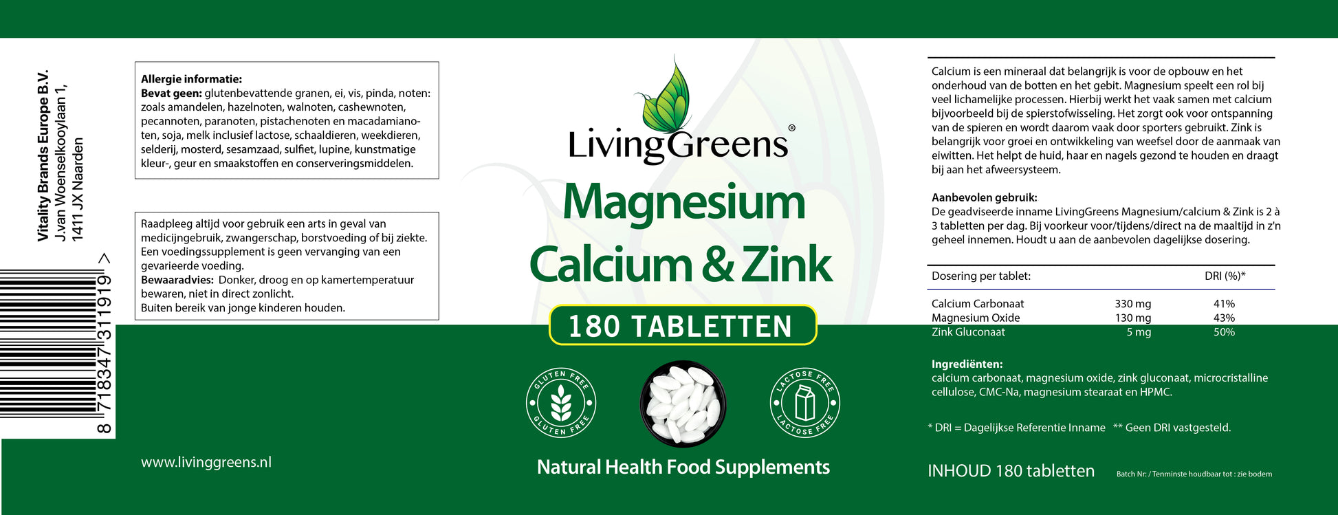 Livinggreens Magnesium calcium zink 180 tabletten is een voedingssupplement. Een supplement is geen vervanging voor gezonde voeding. Evenwichtige en gevarieerde voeding en een gezonde levensstijl zijn belangrijk. Een voedingssupplement vervangt dit niet. Voor aanvullingen geldt dat je: