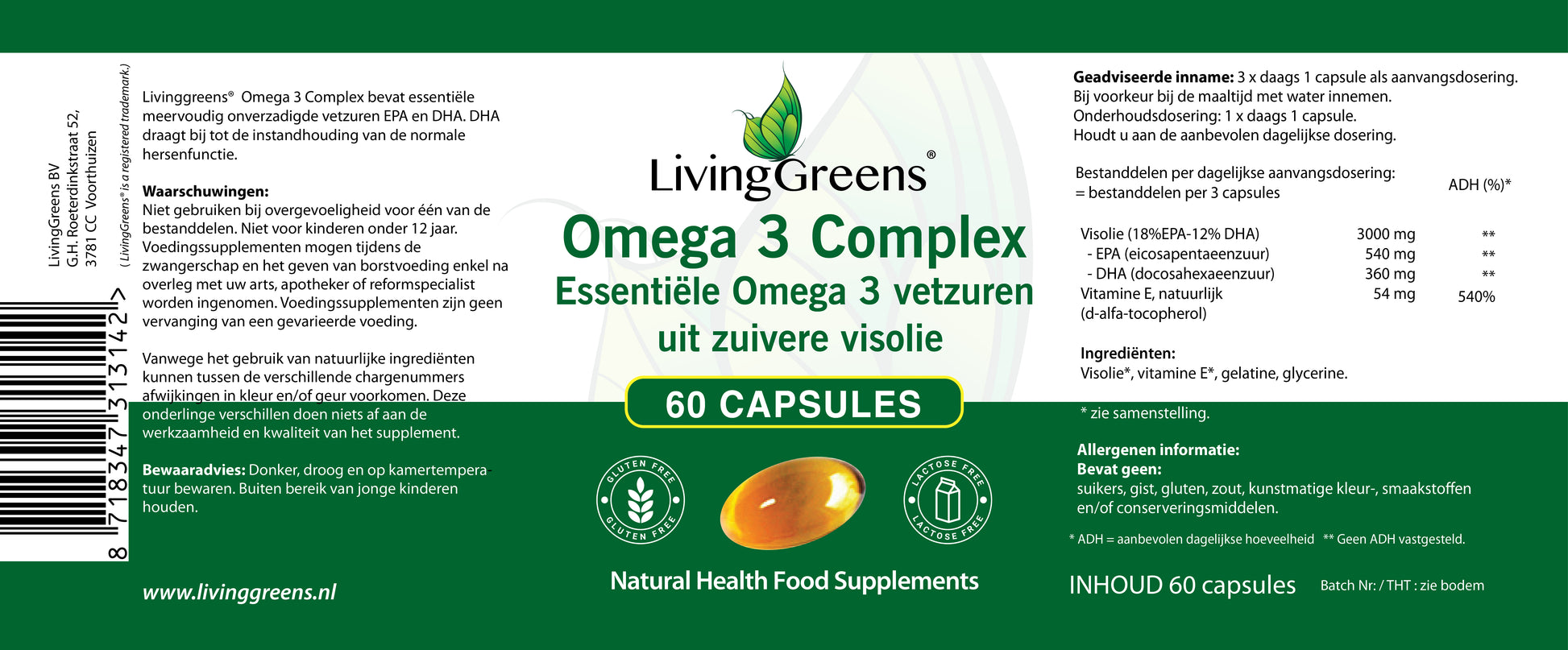 LivingGreens Omega 3 vetzuren helpen bij een normale werking van het hart, de hersenen en het gezichtsvermogen. LivingGreens Omega-3 vetzuren wordt vaak gebruikt bij hormonale schommelingen en voor de huid.Omega 3 visolie complex 60 capsules