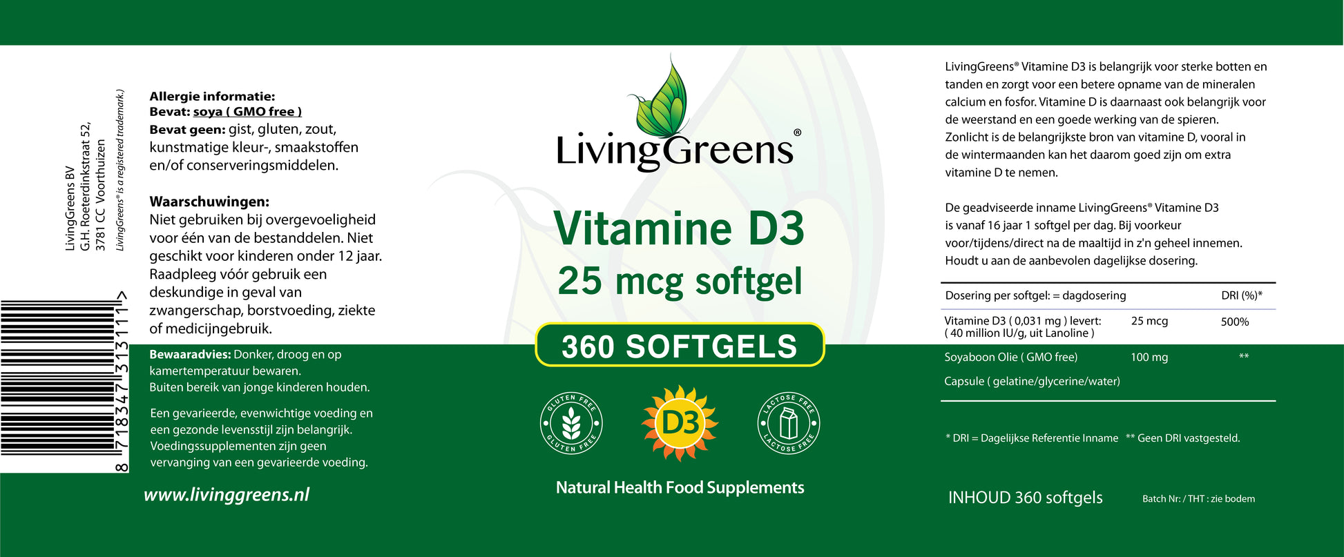 LivingGreens Vitamine D3 25 mcg 360 softgels is een voedingssupplement.
